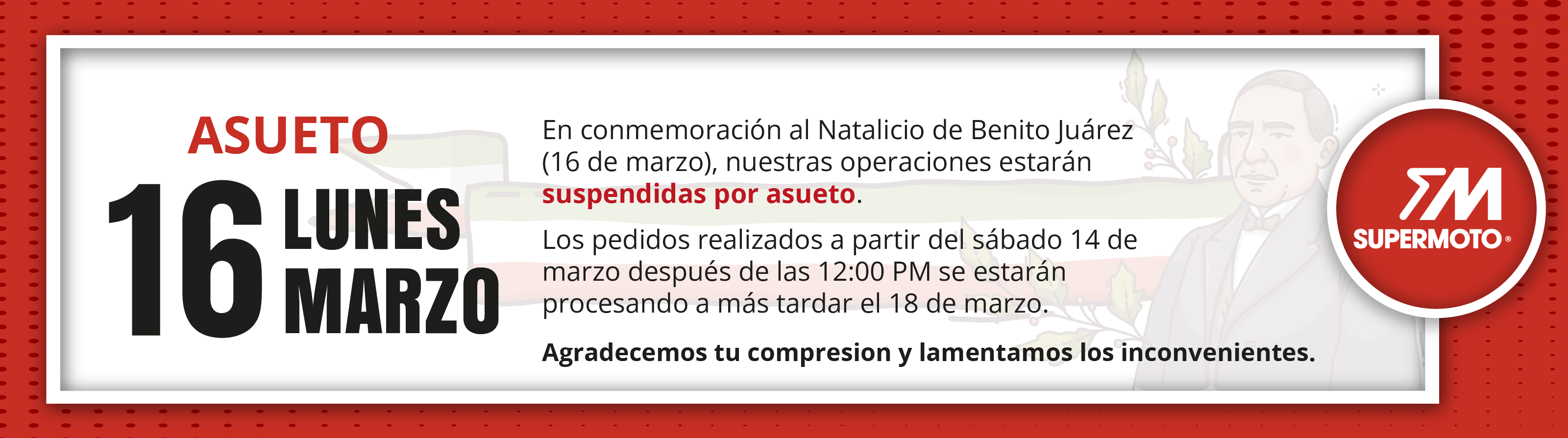 Con fines informativos, en supermoto.mx se citan algunas marcas registradas de motocicletas solo para referencia de las aplicaciones de sus componentes: YAMAHA una marca registrada de YAMAHA CORP., HONDA una marca registrada de HONDA GIKEN KOGYO KABUSHIKI KAISHA, D/B/A HONDA MOTOR CO., LTD., ITALIKA una marca registrada de ELEKTRA TRADING & CONSULTING GROUP, S.A. DE C.V., SUZUKI una marca registrada de SUZUKI MOTOR CORPORATION, VENTO una marca registrada de Isaac Calderon Birch, KURAZAI una marca registrada de Grupo Famsa S.A.B. de C.V., DINAMO una marca registrada de CONSORCIO PEREDO, S.A. DE C.V., VELOCI una marca registrada de Veloci Motors S.A. de C.V. BAJAJ una marca registrada de BAJAJ AUTO LIMITED, TVS una marca registrada de SUNDARAM-CLAYTON LIMITED.