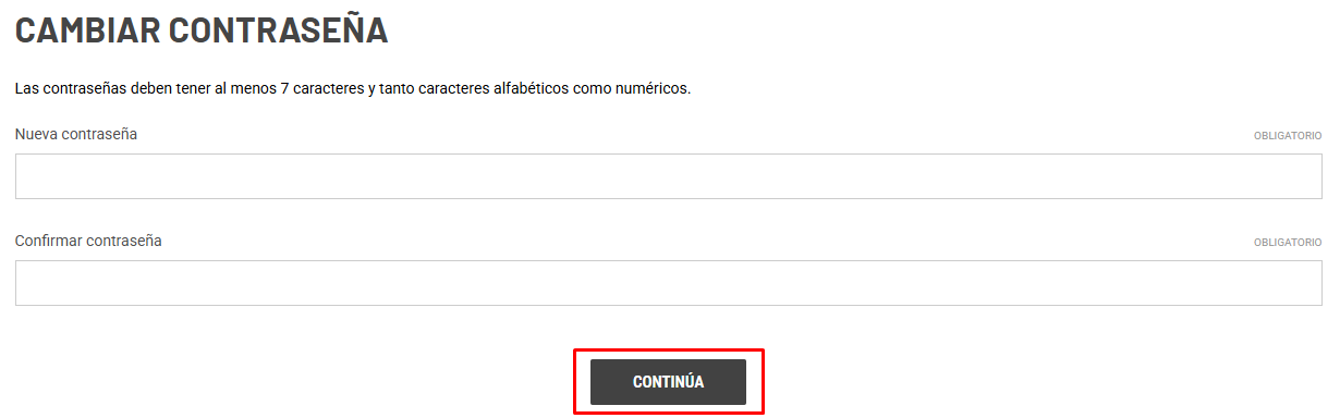 Da clic en el enlace y te llevara a un formulario. Indica tu nueva contraseña en ambos campos y da clic en CONTINUA